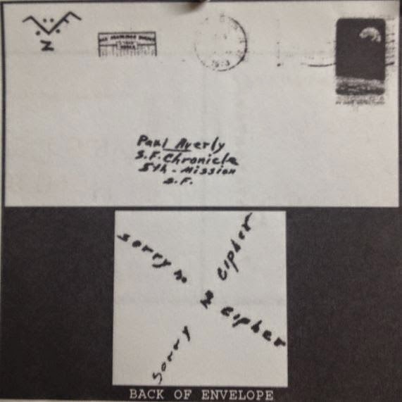 Inside the envelope of his Halloween card, Zodiac wrote "sorry no cipher" twice, in an X-pattern. The two sentences intersect at the word "no", closer in my opinion to the letter "o", as if to highlight it.