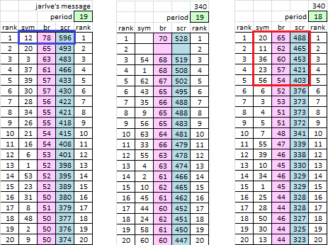 However, I did the same thing with the 340 period 18 ( right ), and found that although the scores are not quite as high, deleting symbol 20, the B, had the highest response. I found that interesting because the B is not cyclic. Other high count symbols, such as 11, 36 and 23, caused higher responses. Maybe that is no big deal because we already know about the period 19 repeats, and these results may be expected.