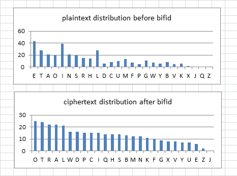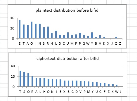 Also, bifid is very similar to a two row railfence, except that it uses the polybius square to make all of the ciphertext 1 polyalphabetic. As a matter of fact, instead of using the transposition of coordinates as described on websites, you can encode two symbols at a time, and then use a two row railfence cipher to get the exact same result! Provided that the plaintext period is an even number instead of an odd number.