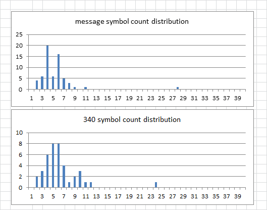 Alright, so here is a typical ciphertext 2 count distribution, and the last one that I made. They all look very similar to each other, and very similar to the 340 symbol count distribution. Except that there aren’t any high count symbols like the +, and typically there aren’t many with symbol counts higher than 10. That’s what I am going to do next, to see if I can get closer to 340 stats.