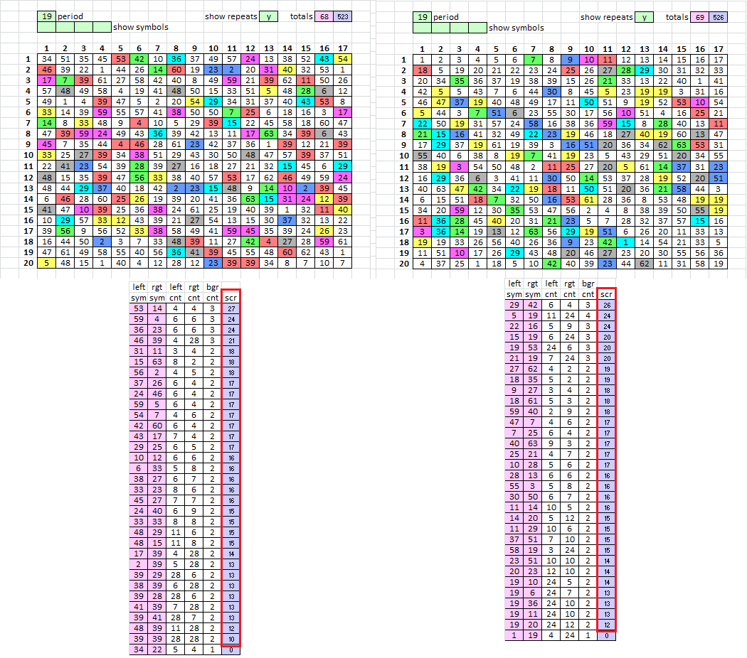 I saved the top two, smokie31a and smokie31b, at the bottom left and right. Smokie31a has 45 period 38 matches, but only 40 period 19 matches. Smokie31b has 44 period 38 matches, but 53 period 19 matches. They both have a couple of repeat stats that reach down into the lower levels of the spreadsheet. So, it would seem that although the plaintext period chunks are transposed independently of each other, perhaps the alignment of the period 19 repeats occasionally line up with each other. But neither message had high scores for both period 19 and period 38 messages.
