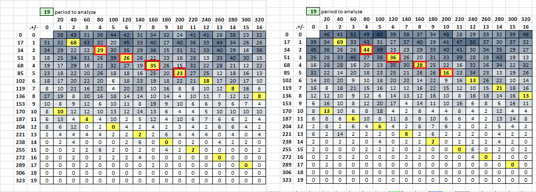 I made 100 messages with a plaintext period of 30, and inscribed right left top bottom to make the period 15 repeats / matches look like period 19 repeats / matches. All ciphertext 2 encoding homophonic. Here is a distribution. The mean is 33 and standard deviation is 7.1. The highest was 51, but that is not close to the 340, which has 69 period 19 matches. That would be 5 sigmas.