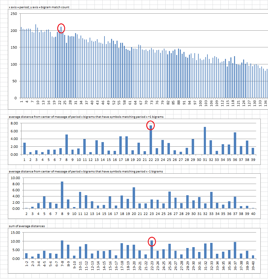 How does "average distance from center of message of period x bigrams that have symbols matching period x+1 bigrams" work? It basicly tries to detect mixing of periods right?