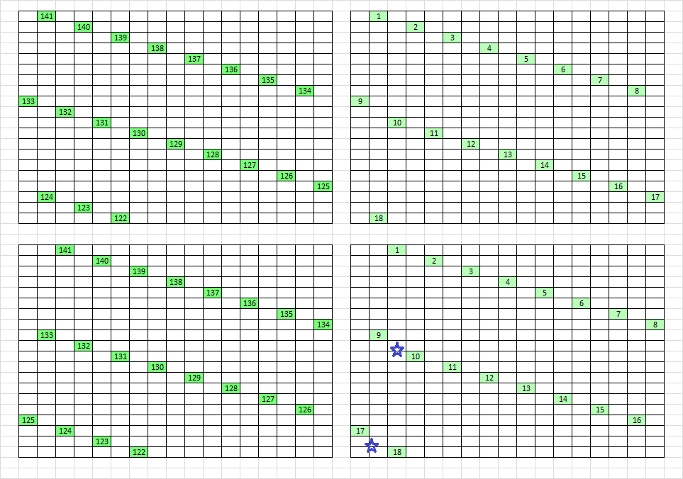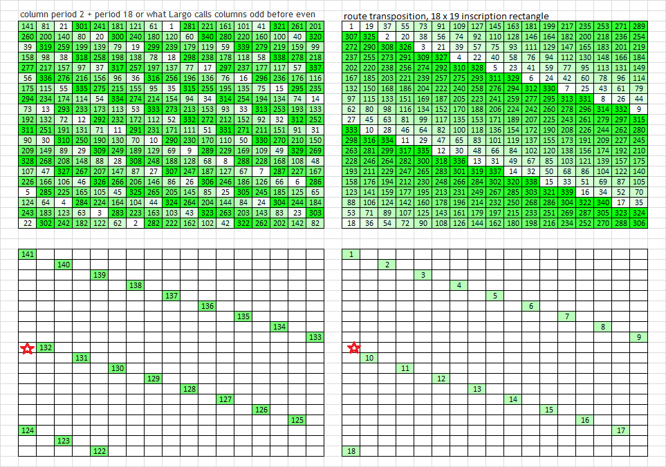 If I cut column 17, scroll the message to the right, and paste it into column 1, your matrix continues the angled row, but the route transposition matrix angled row is misaligned. Two iterations of this.