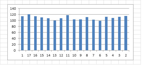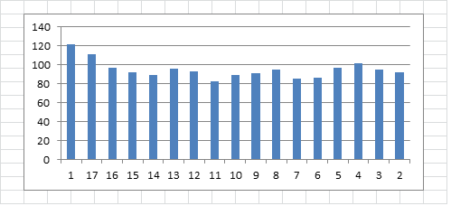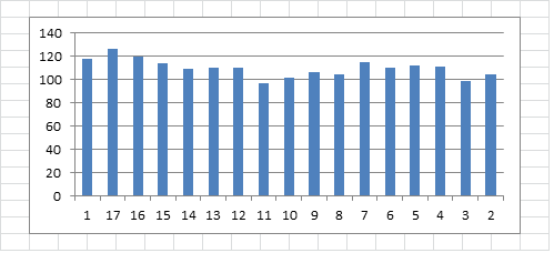 Here is the 340. X axis is the leftmost column ( 1 means undisturbed message, 17 means 17th column shifted to the leftmost position, etc. ). Y axis is the count of cells highlighted because they are part of a period 19 repeat. For the 340, Y varies between about 100 to 120.