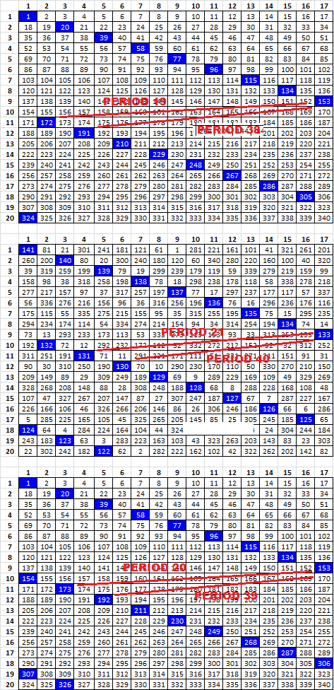 Here is you matrix ( middle picture ). If I go right two spaces, but stay in row 9, then down one, I really only move two spaces. Period 2 becomes period 21, and period 3 becomes period 40. So that seems to make the matrix less viable.