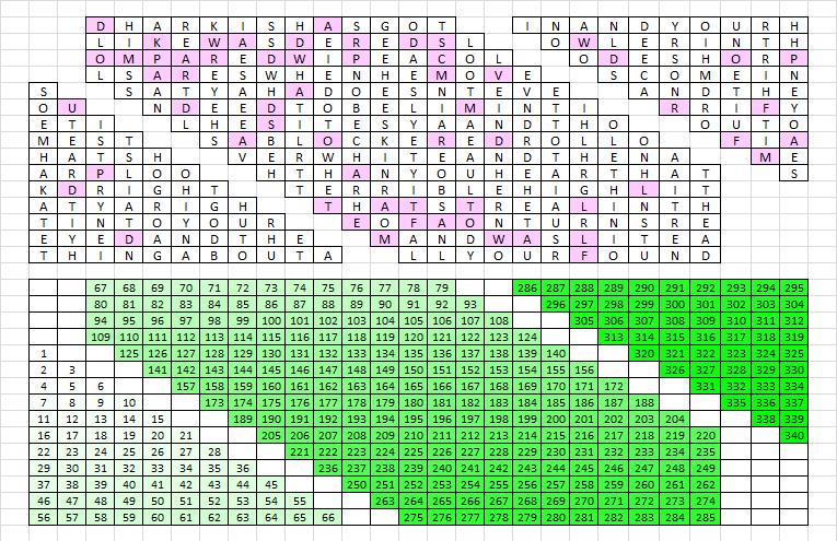 That’s an interesting take smokie, I am not sure what you did though. The cipher is diagonal transposition in 16 by 22 then put in 17 by 20 and flipped.