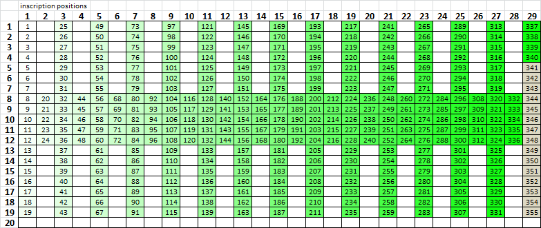 I made a new spreadsheet this week, where I can type positions into an inscription shape, read horizontal or vertical, and inscribe horizontal four directions. Trying out a lot of different shapes and schemes, like the one below ( which didn’t work out ). I am still contemplating the pivots and the P29/39 spike. There would still be a P29 spike even without the pivots, and it really is the most intriguing mystery. I have also been working on the glowerpower solution at times. Still here.