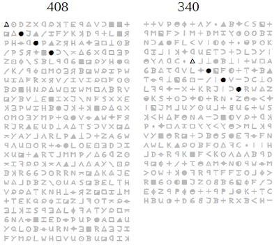 I noticed that the first two parts of the z340 (on the right), the first 18 lines, which were divided in two parts of 9 lines and read in period 19, decoded brilliantly by the team, are centered exactly with the cipher 408 in its first 22 lines.