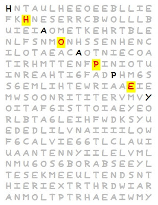 When we transpose this fragment in column, as I have always done, that is, keeping it in 17 columns, the word HOPE, appears in diagonal, in a jumbled way, in period 19.