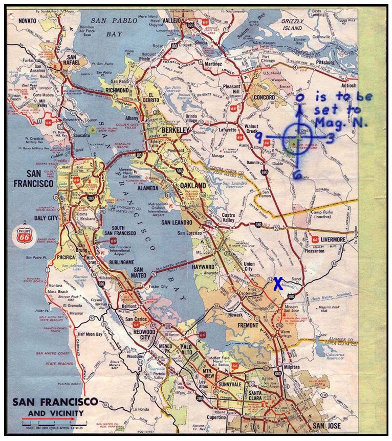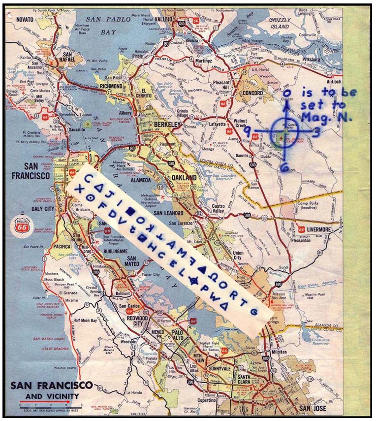 Having then composed the coordinates into a cipher you can’t, of course, just send this alone, so you have to send the original map as well – being sure, of course, that you first erase the site location ‘x’. You post this: