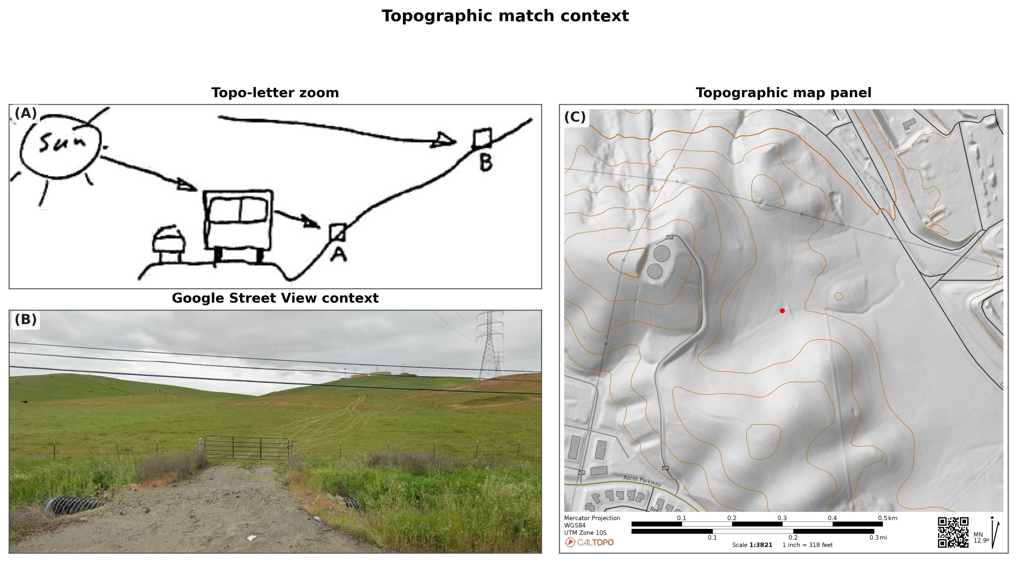 This is not presented as definitive proof, although the roadside depression he depicted, and the prominent hills are definitely there.