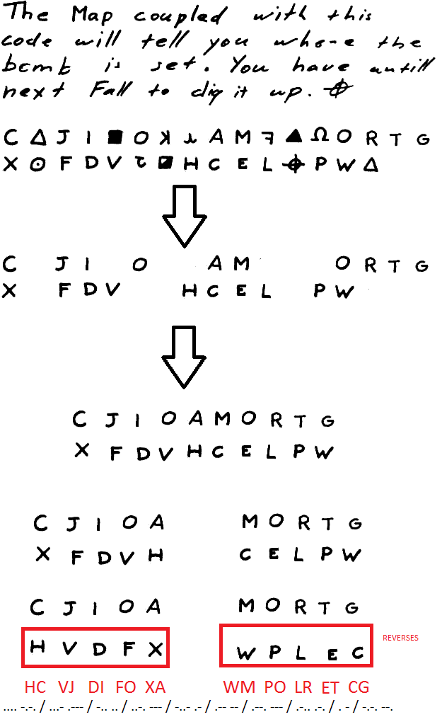 Here, as in most theories, symbols and keep the letters are discarded as the image, and follow the path of the bottom up leaving a sequence of letters, which worked in morse result in what is being presented.