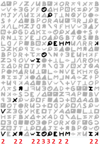 I watched reading http://zodiackillerciphers.com/wiki/index.php?title=Encyclopedia_of_observations,"Many symbols among the last 18 symbols are found directly above in the same columns. The "QEHM" sequence is particularly noteworthy. (Source: glurk)